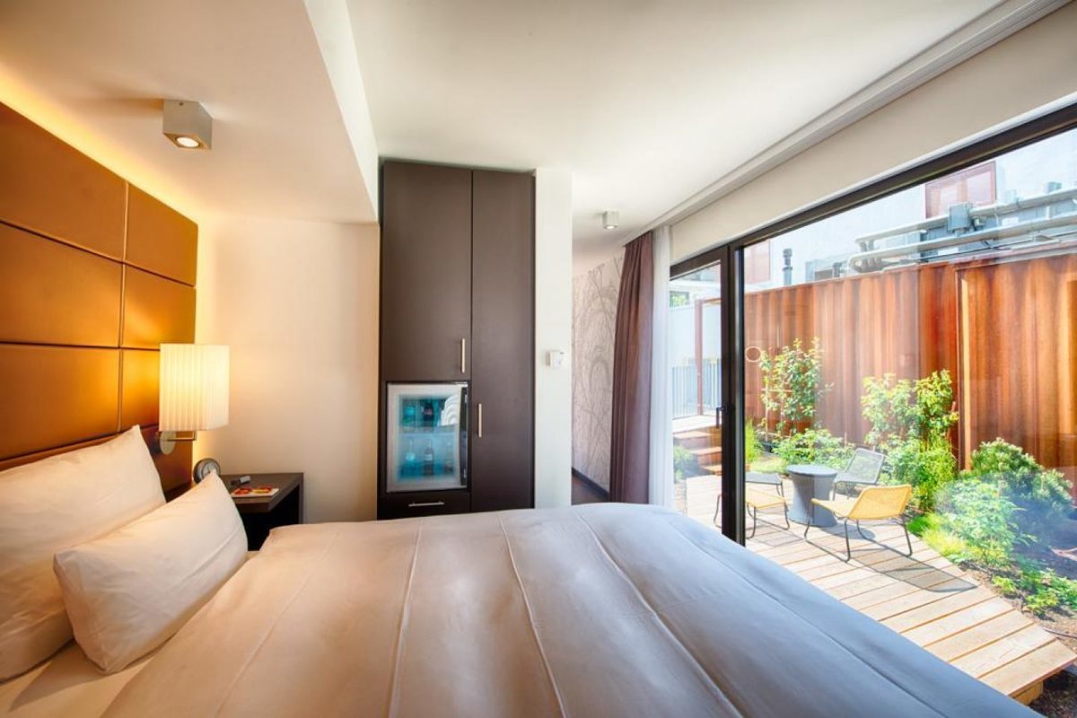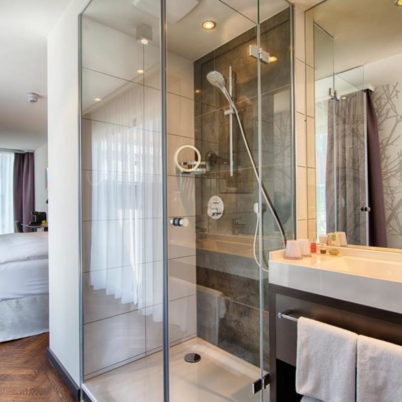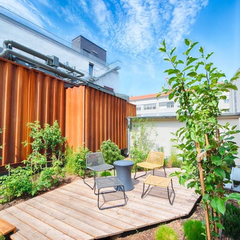 The SUPERIOR CONTAINER rooms are our most extraordinary rooms (25 m²). They are designed in shipping containers and are located on the rooftop of the neighbouring building (3rd floor) with view on the inner courtyard. The containers are surrounded by a lovingly laid out and green terrace. Apple trees, strawberries, raspberries and other berries are growing here. If you’re looking for a unique accommodation, this is definitely the category you should book. The way to the containers is not accessible, extra beds can’t be added.